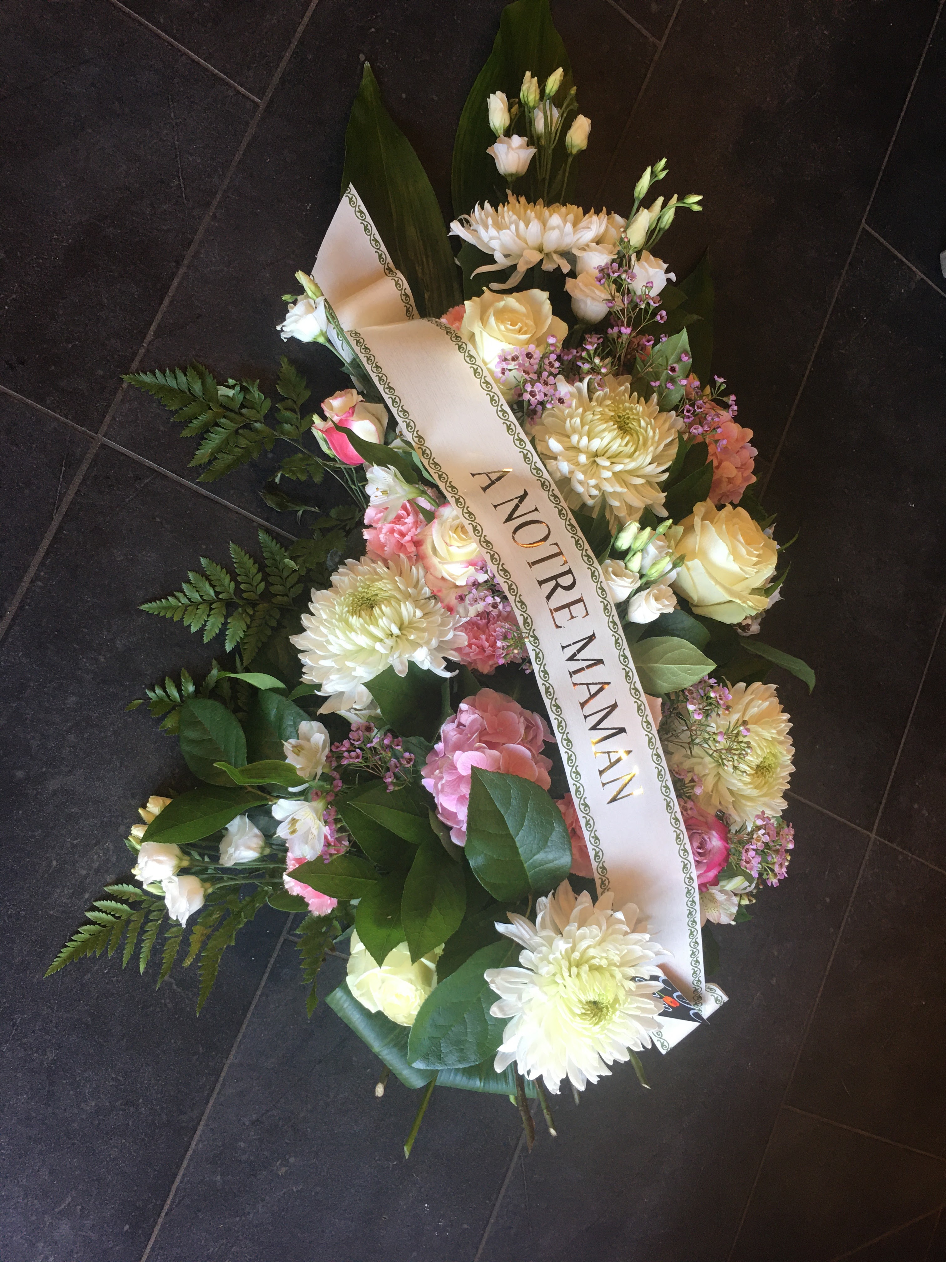 Composition florale pour une cérémonie funéraire. Splendide, beaucoup d’élégance et de fraîcheur. Adresse fortement recommandée.