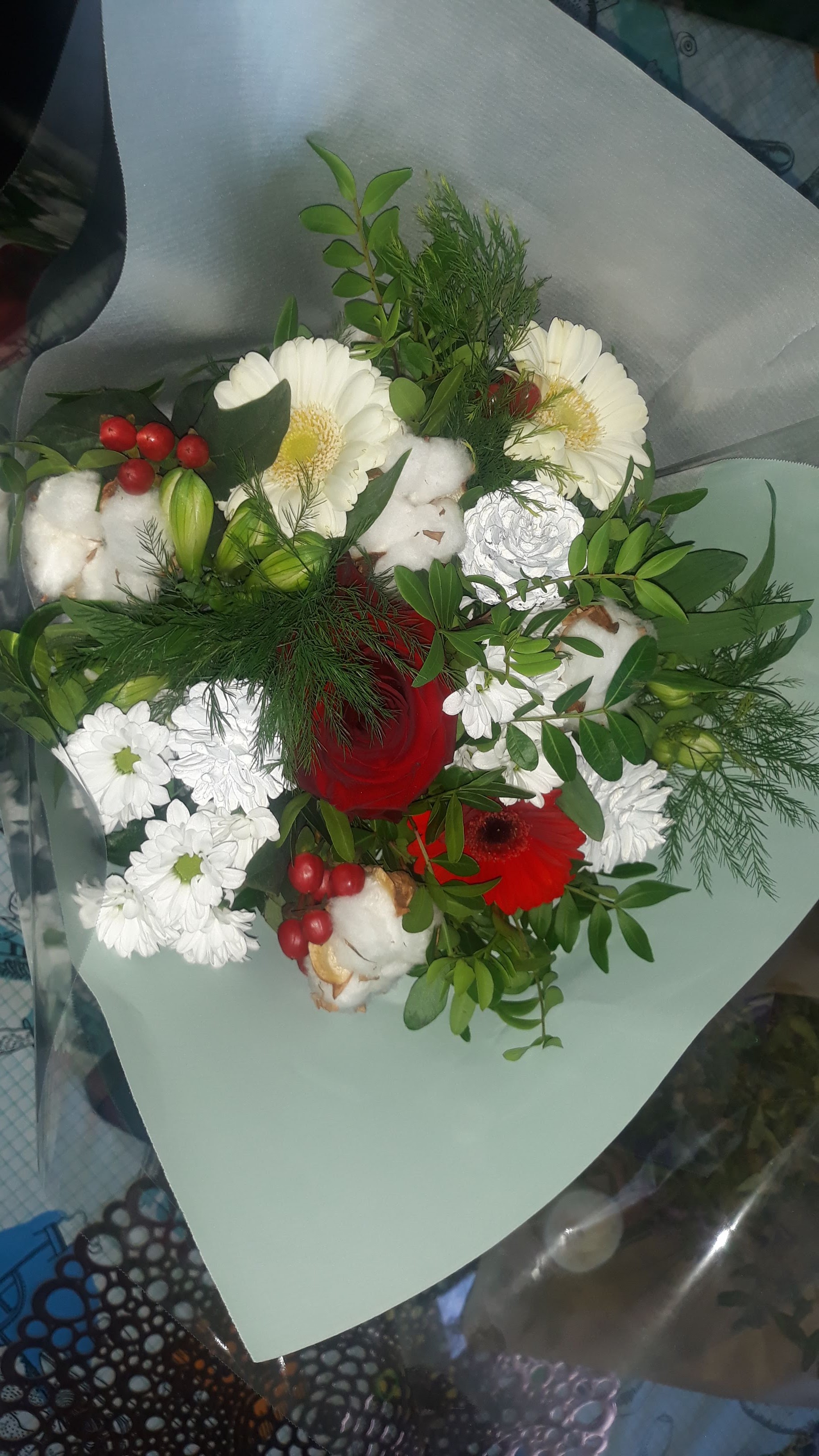 Recu par interfora super bouquet rond avec des branches de sapin, roses rouges, blanches, Lys blancs et 1 boule de Noël dorée pour mon Anniversaire et qui marquait en même temps Noël. Ma fille avait choisi bouquet libre aux soins du du fleuriste. (Très reussi) Merci a Couleurs de Fleurs à Villeurbanne pour son professionnalisme.