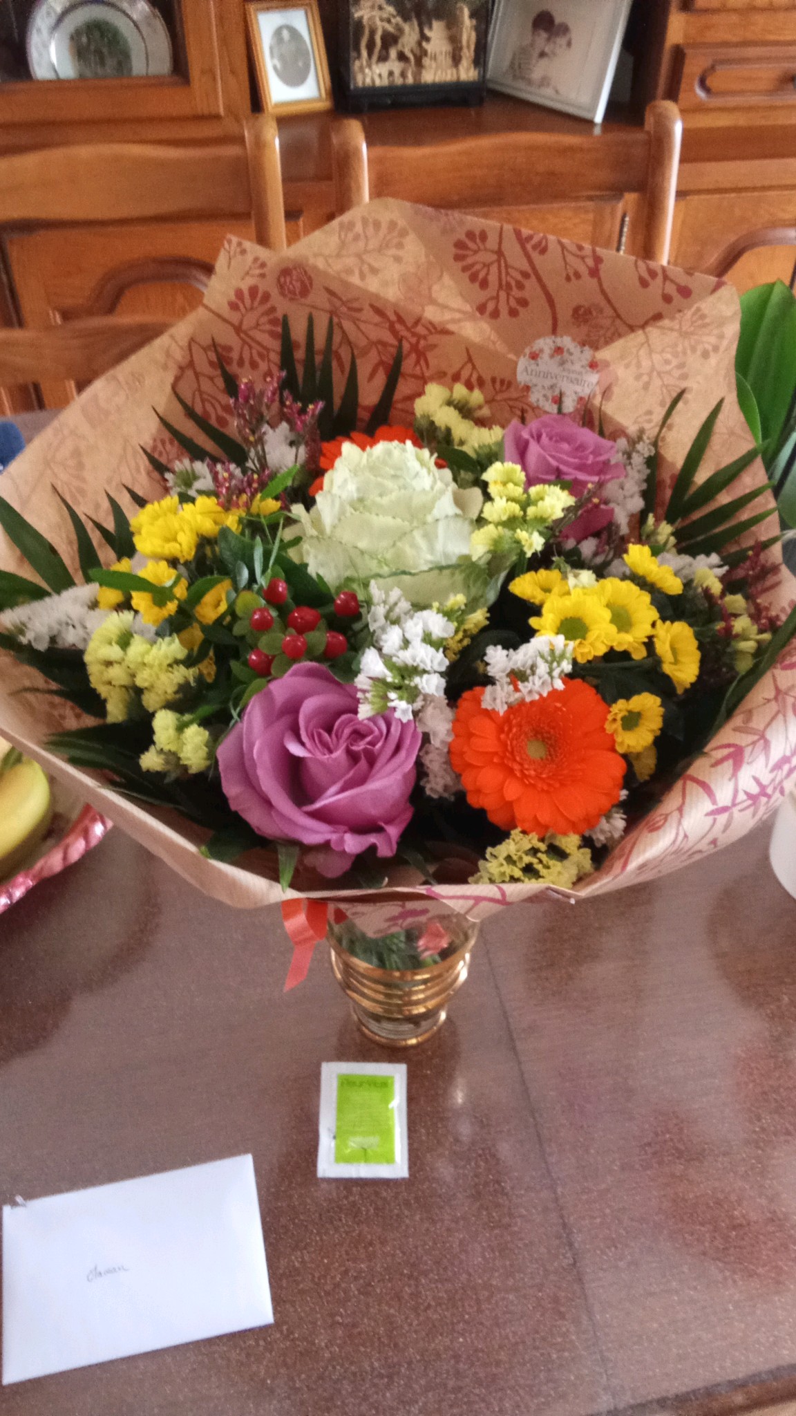 N'habitant pas sur place, j'ai commandé par téléphone ce bouquet qui s'appelle Simple bonheur pour l'anniversaire de ma maman. Cette charmante fleuriste a été de très bon conseil et a mis le bouquet à disposition en temps et en heure, de plus il magnifique ! Merci beaucoup !