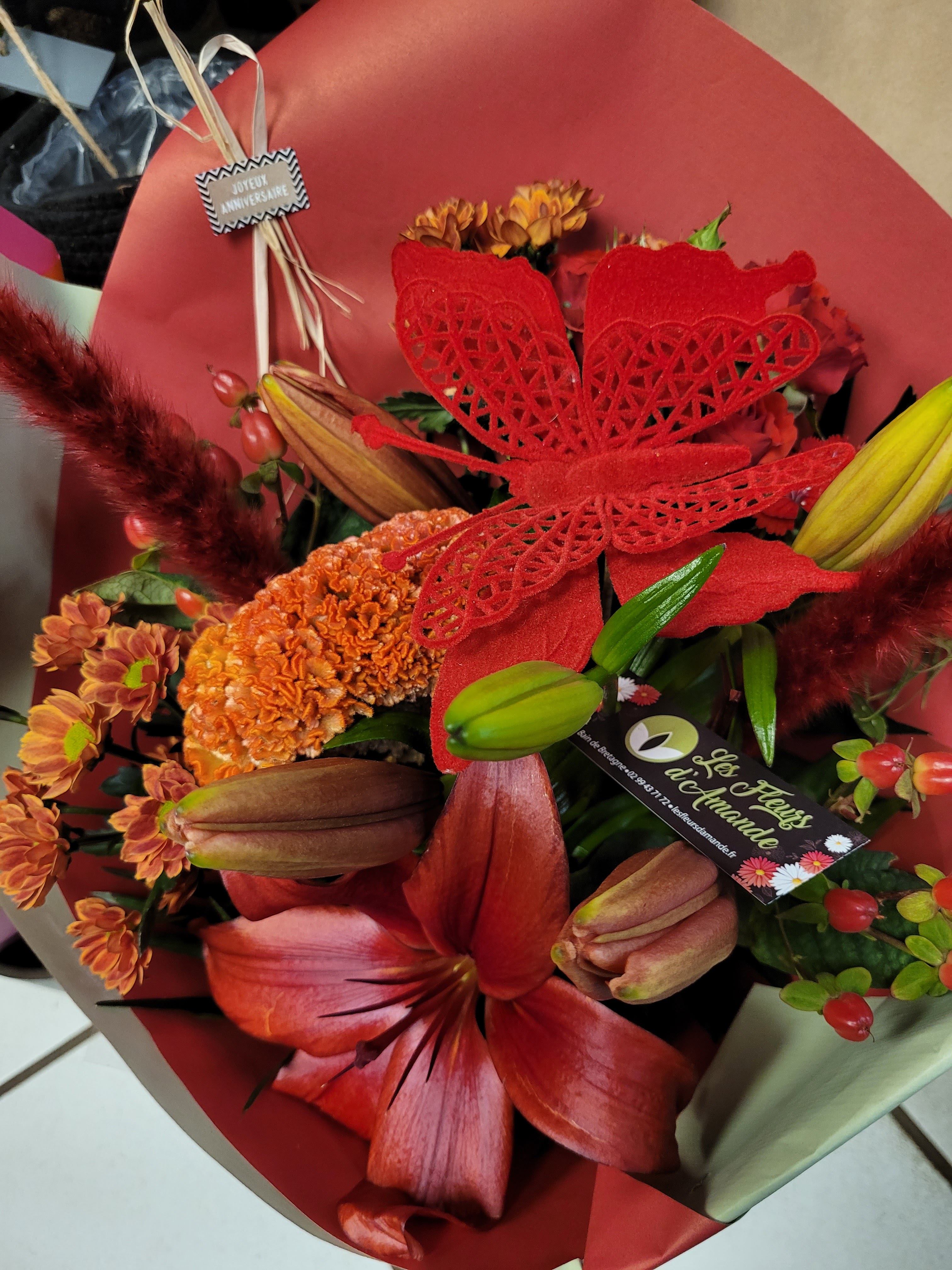 Appel à 9h30 pour création d'un bouquet d'anniversaire . A 11h30 ,en fonction de leur livraison de fleur fraîche, le bouquet était prêt ! Bien assemblé et j'ai même pu aller le chercher sur leur temps du midi donc hyper serviable ! Au top !