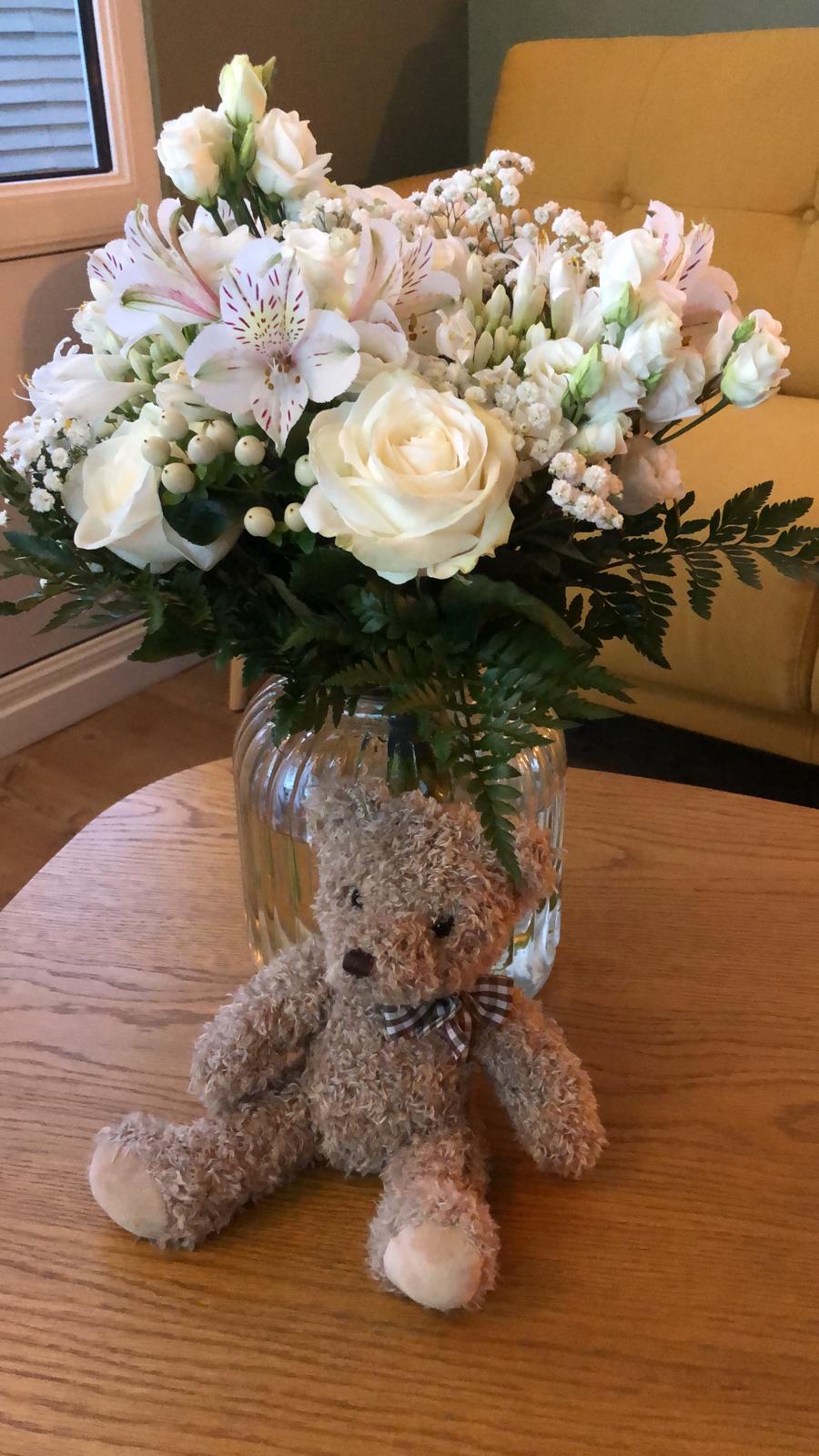 Nous avons commandé un bouquet (le bouquet sur la photo a 5 jours) pour une naissance à envoyer par interflora avec Harry la peluche et une boîte de chocolats ( très bon), nous avons signalé que la maman et la petite Louise sortaient de la maternité a 12h , arrivées à la maison elles ont croisées le livreur, ça c est du timing. Bravo!!!!!!! J ai eu a faire a eux pour mon mariage c était parfait aussi, les filles sont a l écoute. J y retournerai sans aucune hésitation.
